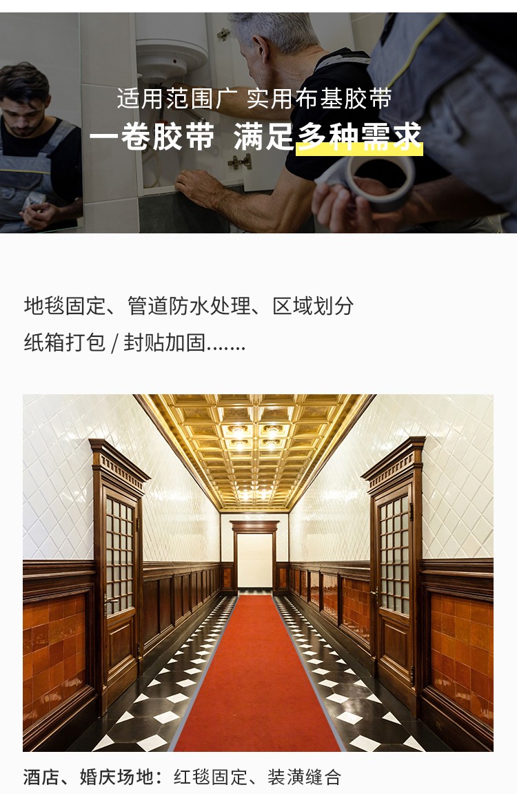 - 布基膠帶以聚乙烯與紗布纖維的熱復(fù)合為基材。經(jīng)過(guò)涂高粘度合而成膠水,之后并與雙面離型紙通過(guò)復(fù)合而成?;寄z帶有較強(qiáng)的剝離力、抗拉力、耐油脂、耐老化、耐溫、防水、防腐蝕,是一種絕緣的高粘膠帶。