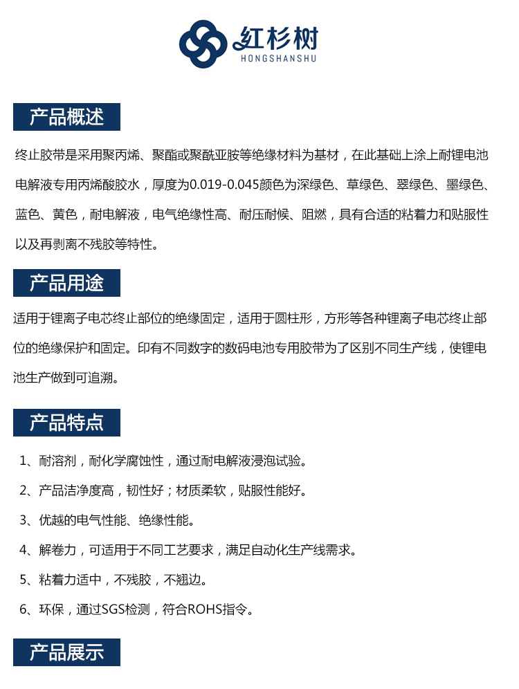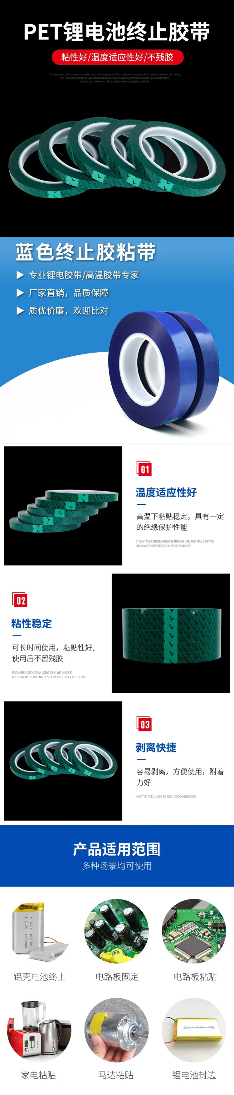 - 終止膠帶是采用聚丙烯、聚酯或聚酰亞胺等絕緣材料為基材,在此基礎(chǔ)上涂上耐鋰電池電解液專(zhuān)用丙烯酸膠水,厚度為0.019-0.045顏色為深綠色、草綠色、翠綠色、墨綠色、藍(lán)色、黃色,耐電解液,電氣絕緣性高、耐壓耐候、阻燃,具有合適的粘著力和貼服性以及再剝離不殘膠等特性。